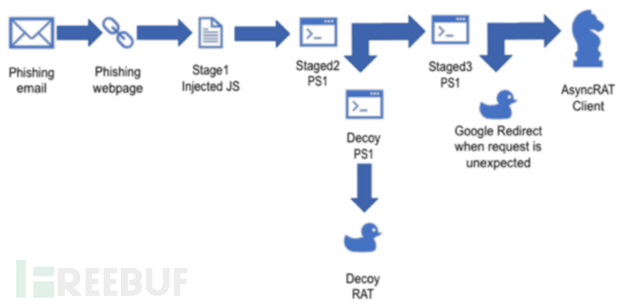 研究人员发现了向毫无防备的受害者投递 AsyncRAT 的攻击行动。在至少 11 个月的时间里,攻击者致力于通过嵌入网络钓鱼页面的 JavaScript 脚本来投递 AsyncRAT 木马。切换了 100 余个域名与三百多个样本文件后,攻击者的攻击模式始终如一。