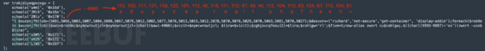 脚本代码经过高度混淆,多个函数嵌套避免直接出现可检测的命令。C&C 的 URL 地址也通过十进制方式进行了混淆。想要解密 URL,必须减去一个常量值再将数字转换为 ASCII 字符串。例如,数组(102 131 138 138 141 62 117 141 144 138 130 63)减去 30 再转换为 ASCII 后对应为字符串 Hello World!。
