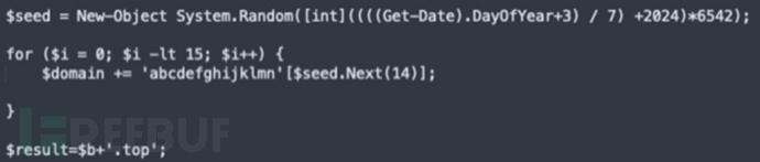 攻击者使用的 DGA 算法会利用日期生成种子并对其进行修改,确保每七天会生成一个新域名,生成日就在周天。种子选取从 a 到 n 的 15 个字母来生成域名。种子中的其他变量(2023 与 6542)用于进行域名模式的变更。
