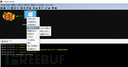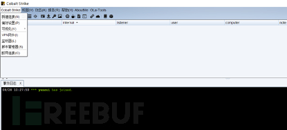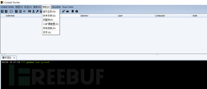 下图为CobaltStrike工作界面及运行环境简单拓扑,其中 前面客户端为攻击者,中间为攻击者的服务端一般是互联网虚拟专用服务器,后面为被攻击者终端,三者之间关系为攻击者通过启动客户端+服务端对被攻击者进行数据获取达到攻击目标。
