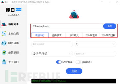 可以看到有5种免杀方式,这直接选择直接执行(工具自动生成exe程序,编译过程中加载恶意shellcode代码)就会生成可执行程序。